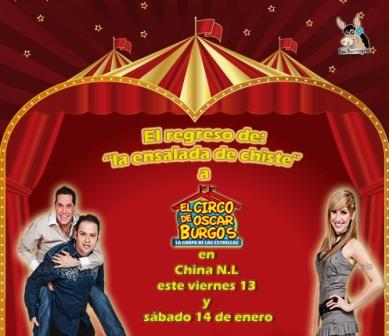 Si eres de China N.L o municipios aledaños no dejes de ir este viernes 13 y sábado 14 de enero a el circo de Oscar Burgos que esta ubicado cerca de "el mini súper Elizondo" porque sera el regreso de... "la ensalada de chistes" estarán presentes, Gilberto Martínez "la parka", Ingrid Leija y Jesús Garza "el burro". Ya puedes ir a comprar tus boletos hay precios súper accesibles.